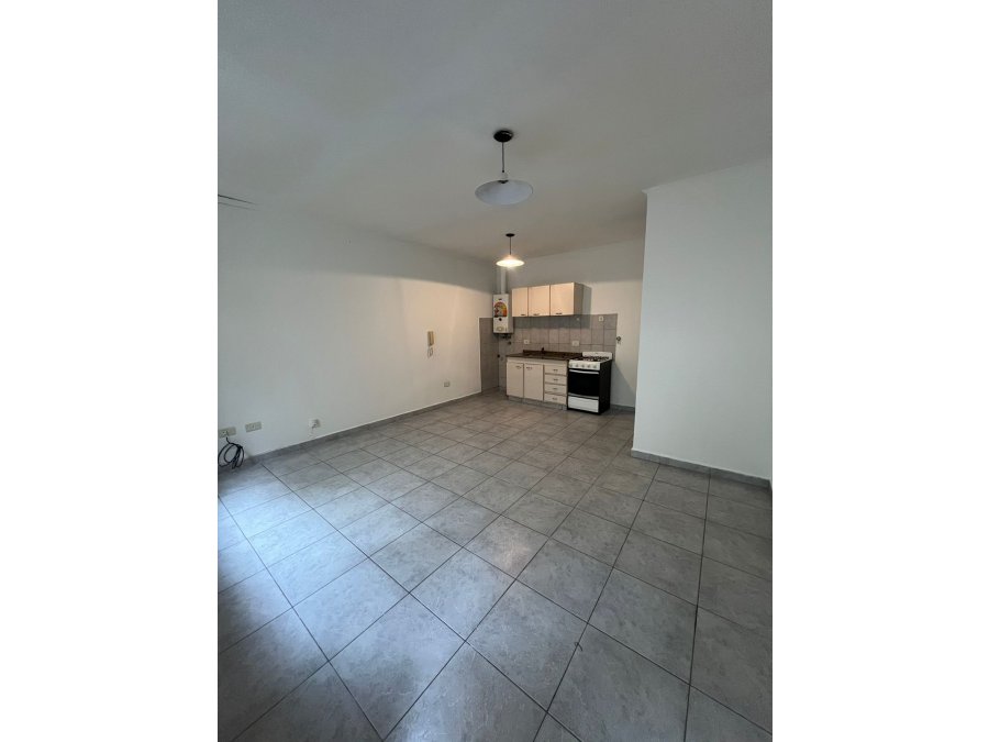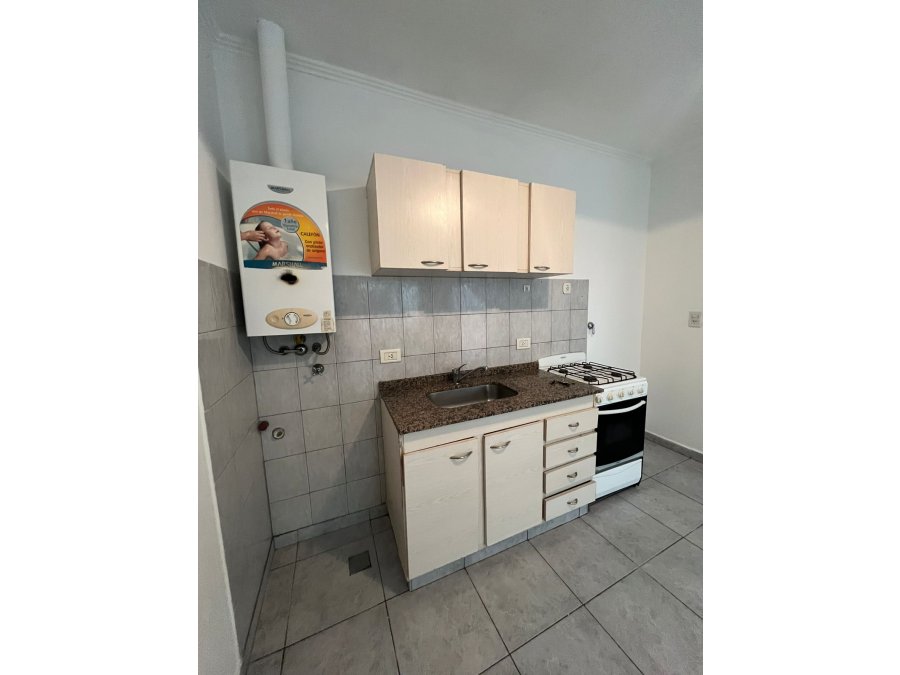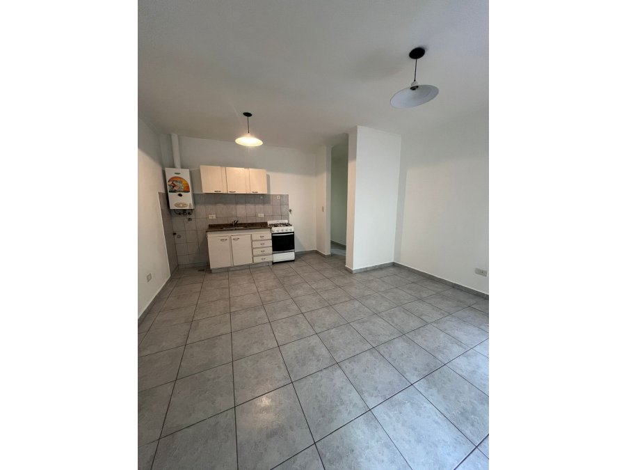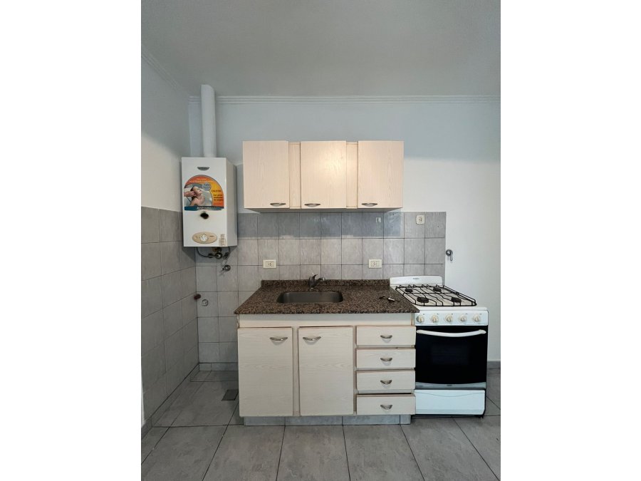 El departamento cuenta con un dormitorio, un baño completo con ducha y un living-comedor con cocina integrada. La cocina está equipada con artefacto de cocina, calefón y mobiliario, lista para usar. Todos los ambientes son amplios y muy funcionales, aprovechando cada espacio.