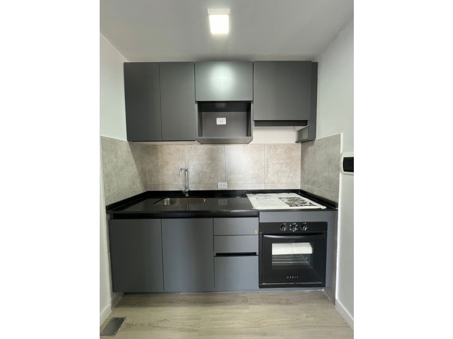 Living-comedor con cocina integrada, equipada con anafe y horno eléctrico.