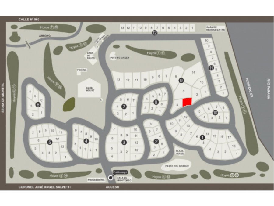 Terreno cuadrangular con uno de los frentes con mayor longitud de todo el campo de golf, con desnivel que supera los 2 metros respecto de la acera, por su altimetría permite construir orientando haca el noroeste con importante visual panorámica hacia los humedales del Paraná.