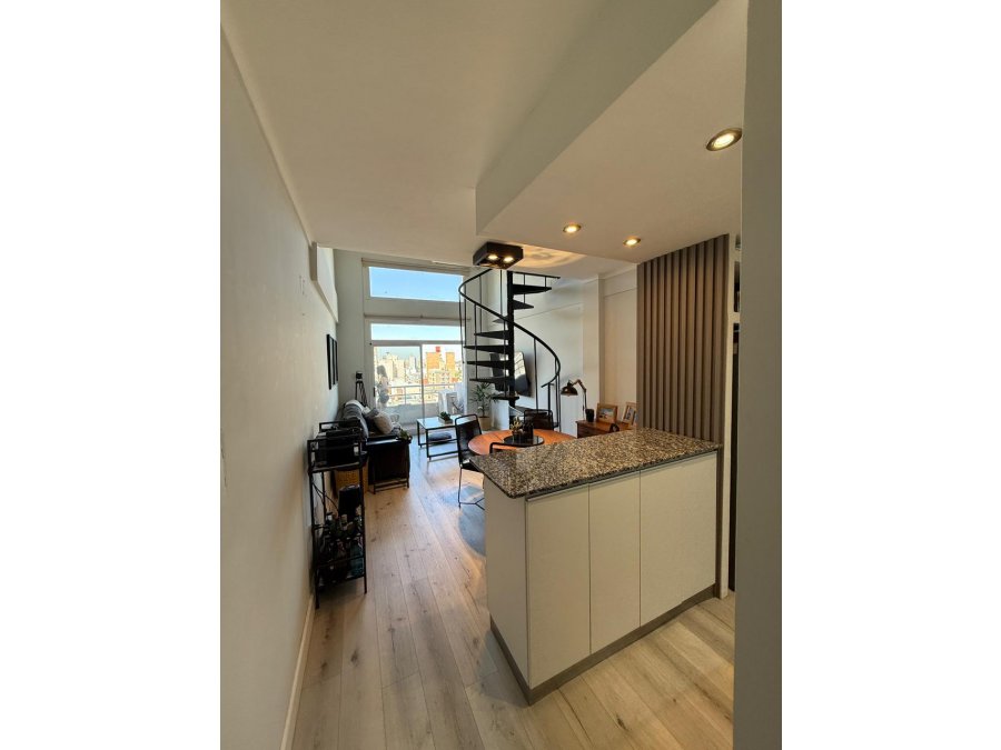 Planta baja cuenta con un baño (hoy usado como lavadero y baño tipo toilete) cocina amoblada completa, con mesada bajo mesada, sectorizada, por un desayunador, seguido por el living comedor todo integrado y un balcón con vista a la ciudad. En la planta alta está compuesto por un dormitorio, con baño completo.