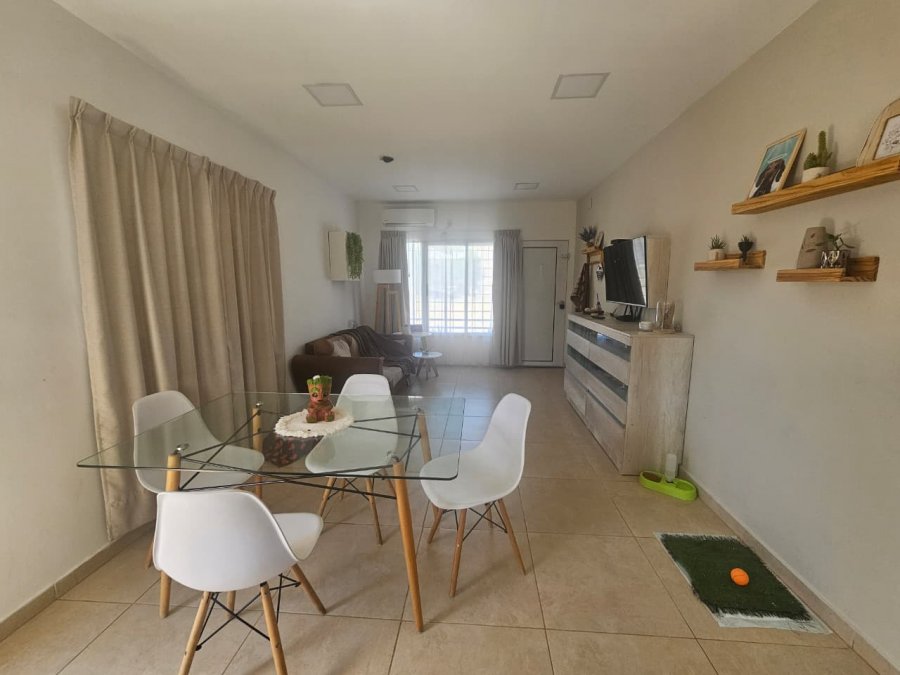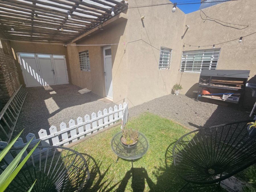 un baño con sanitarios de primera calidad y dos dormitorios con placares. Cochera semi cubierta, patio verde con parrilla.