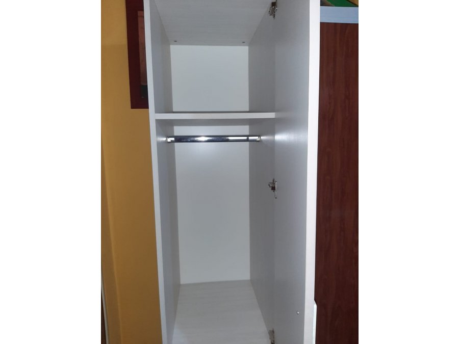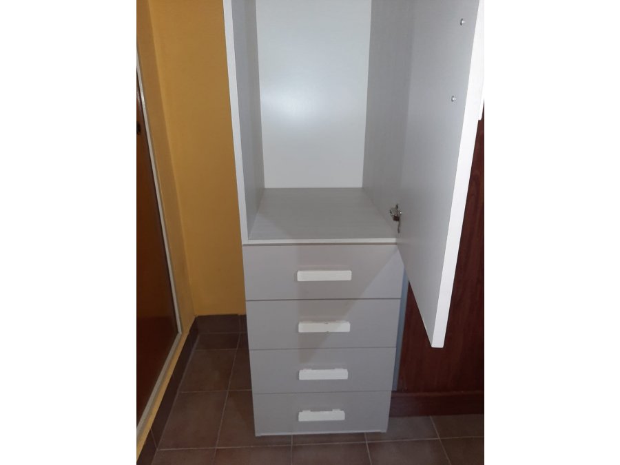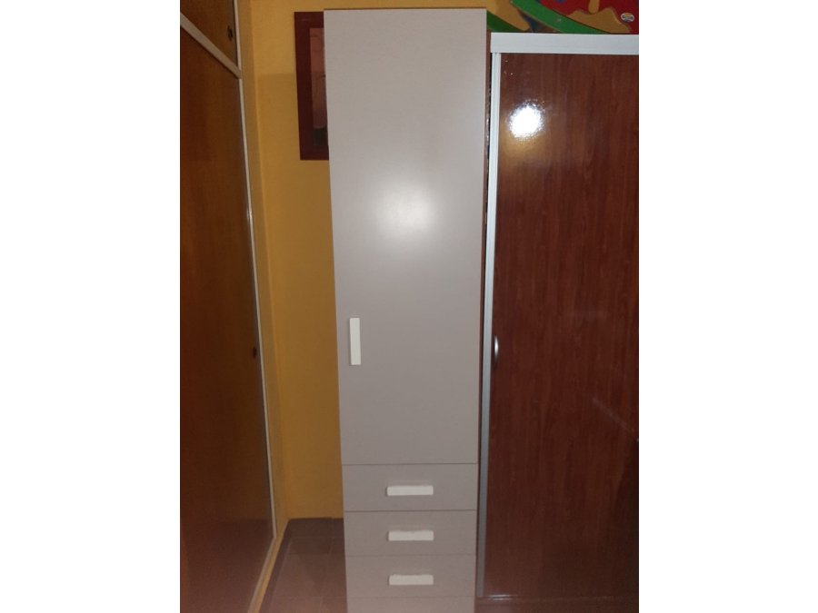 con casco de melamina blanca y frentes laqueados COLOR GRIS. Cuenta con CUATRO cajones con correderas metálicas y UNA puerta, en su interior: UN barral para perchas + UN estante.