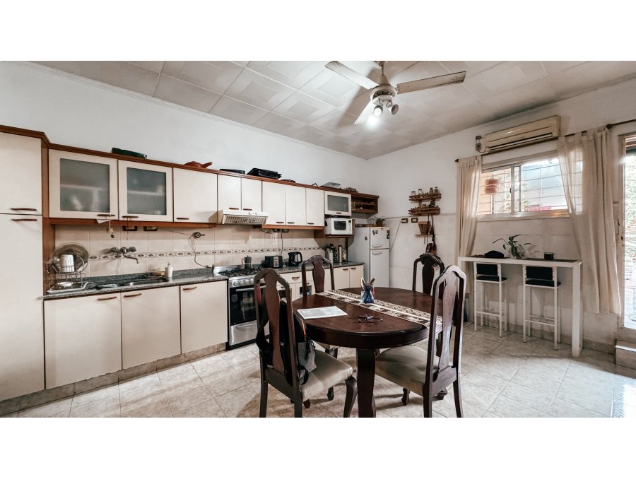 La propiedad cuenta con cochera cubierta con espacio para auto y moto, al ingreso nos encontramos con un ambiente de estar amplio con un patio de invierno el cual brinda mucha luz y ventilacion al ambiente, seguido podemos ingresar a la cocina comedor, el cual cuenta con un amoblamiento de cocina muy comodo con vista al patio, la propiedad cuenta con 2 baños, uno con ante baño y baño completo, y otro de servicio, tiene 2 habitaciones de grandes medidas, una tercera habitacion un poco mas chica. En el fondo el inmueble cuenta con una galeria con parrilla, habitacion de lavanderia y espacio verde.